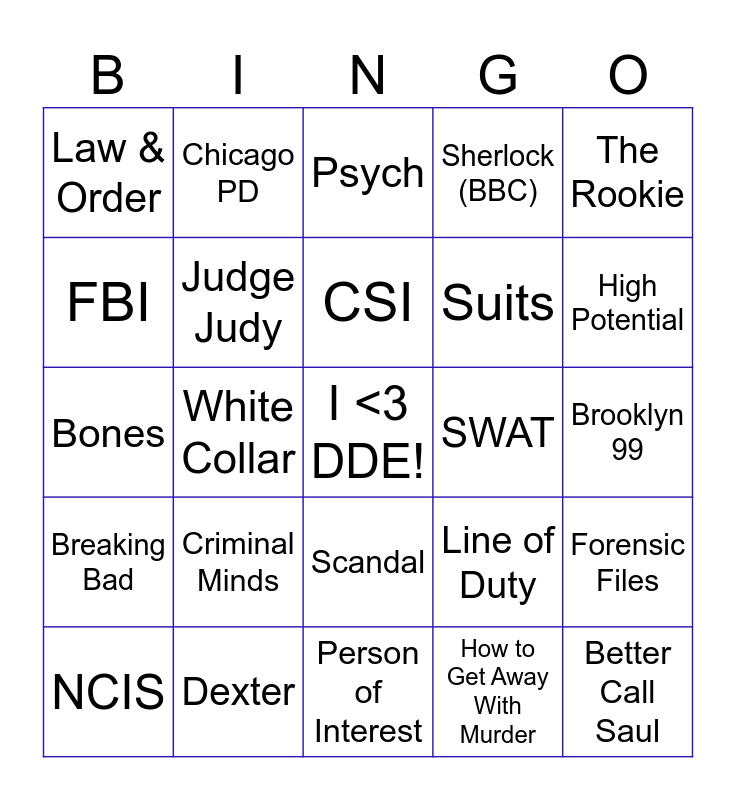 This bingo card has a free space and 24 words: Criminal Minds, Dexter, CSI, NCIS, The Rookie, Law & Order, FBI, Chicago PD, SWAT, Scandal, Suits, Bones, Line of Duty, Forensic Files, Judge Judy, How to Get Away With Murder, Brooklyn 99, Psych, High Potential, White Collar, Better Call Saul, Breaking Bad, Sherlock (BBC) and Person of Interest.
