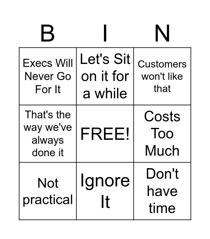 This bingo card has a free space and 24 words: We tried that before, I DONT KNOW, Ignore It, I'll Get Back To You, Don't have time, Execs Will Never Go For It, Costs Too Much, Let's Sit on it for a while, Bruce won't go for that, Now is not the right time, Not enough help, Let's give it more thought, We've always done it this way, It's impossible, Not practical, Too much work, Older generation will not use it, Customers won't like that, Too big of a change, That's for the future, Why change it, What we have is good enough, That's the way we've always done it and It won't work in our industry.