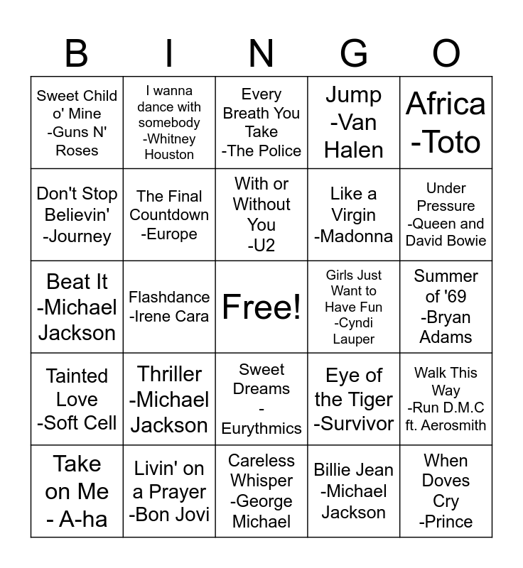 This bingo card has a free space and 24 words: Thriller -Michael Jackson, Livin' on a Prayer -Bon Jovi, With or Without You -U2, Take on Me - A-ha, Africa -Toto, Sweet Child o' Mine -Guns N' Roses, Don't Stop Believin' -Journey, I wanna dance with somebody -Whitney Houston, Girls Just Want to Have Fun -Cyndi Lauper, Sweet Dreams -Eurythmics, Like a Virgin -Madonna, Beat It -Michael Jackson, Eye of the Tiger -Survivor, Walk This Way -Run D.M.C ft. Aerosmith, The Final Countdown -Europe, Billie Jean -Michael Jackson, Summer of '69 -Bryan Adams, Every Breath You Take -The Police, Under Pressure -Queen and David Bowie, Flashdance -Irene Cara, When Doves Cry -Prince, Tainted Love -Soft Cell, Jump -Van Halen and Careless Whisper -George Michael.