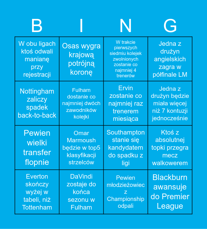 This bingo card has 16 words: DaVindi zostaje do końca sezonu w Fulham, Ktoś z absolutnej topki przegra mecz walkowerem, W trakcie pierwszych siedmiu kolejek zwolnionych zostanie co najmniej 4 trenerów, W obu ligach ktoś odwali manianę przy rejestracji, Pewien wielki transfer flopnie, Osas wygra krajową potrójną koronę, Southampton stanie się kandydatem do spadku z ligi, Pewien młodzieżowiec z Championship odpali, Nottingham zaliczy spadek back-to-back, Fulham dostanie co najmniej dwóch zawodników kolejki, Everton skończy wyżej w tabeli, niż Tottenham, Jedna z drużyn angielskich zagra w półfinale LM, Omar Marmoush będzie w top5 klasyfikacji strzelców, Jedna z drużyn będzie miała więcej niż 7 kontuzji jednocześnie, Ervin zostanie co najmniej raz trenerem miesiąca and Blackburn awansuje do Premier League.
