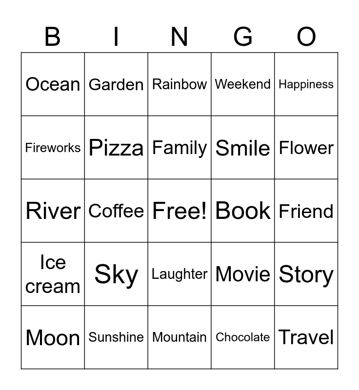 This bingo card has a free space and 30 words: Sunshine, Adventure, Coffee, Music, Ocean, Rainbow, Pizza, Laughter, Book, Mountain, Friend, Travel, Chocolate, Dream, Flower, Dance, Movie, Ice cream, Sky, Happiness, River, Star, Garden, Smile, Fireworks, Weekend, Story, Moon, Family and Game.