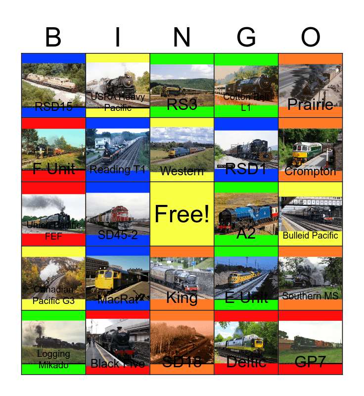 This bingo card has 24 images, a free space and 24 words: MacRat, Black Five, Western, Logging Mikado, Prairie, RSD15, F Unit, USRA Heavy Pacific, A2, King, RSD1, Union Pacific FEF, E Unit, Southern MS, Reading T1, Deltic, Bulleid Pacific, RS3, Crompton, SD45-2, GP7, Canadian Pacific G3, Cotton Belt L1 and SD18.