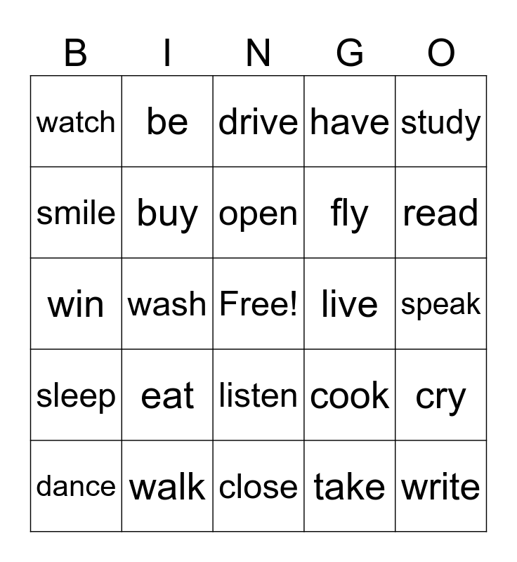 This bingo card has a free space and 24 words: eat, walk, open, dance, study, watch, smile, be, live, listen, fly, win, cook, cry, buy, take, speak, drive, read, wash, write, sleep, have and close.