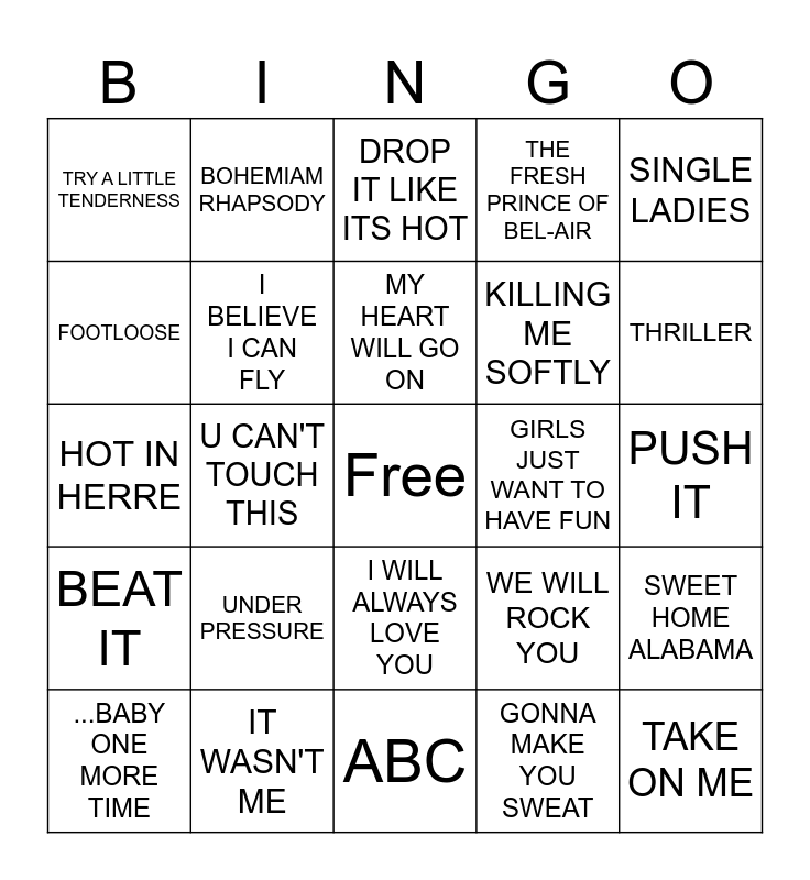 This bingo card has a free space and 40 words: EYE OF THE TIGER, HOT IN HERRE, GOLD DIGGER, I BELIEVE I CAN FLY, IT WASN'T ME, I WILL ALWAYS LOVE YOU, MY HEART WILL GO ON, LET IT GO, SINGLE LADIES, BEAT IT, U CAN'T TOUCH THIS, THE FRESH PRINCE OF BEL-AIR, TAKE ON ME, PUSH IT, GIRLS JUST WANT TO HAVE FUN, UNDER PRESSURE, FAMILY AFFAIR, TRY A LITTLE TENDERNESS, MY GIRL, DROP IT LIKE ITS HOT, SWEET HOME ALABAMA, GONNA MAKE YOU SWEAT, KILLING ME SOFTLY, FOOTLOOSE, I KISSED A GIRL, POISON, IN DA CLUB, LOVE STORY, AT LAST, WHAT MAKES YOU BEAUTIFUL, DON'T STOP BELIEVIN, ...BABY ONE MORE TIME, FORGET YOU, WE WILL ROCK YOU, THRILLER, ABC, UNDER THE SEA, GET LOW, BOHEMIAM RHAPSODY and ALL MY LIFE.