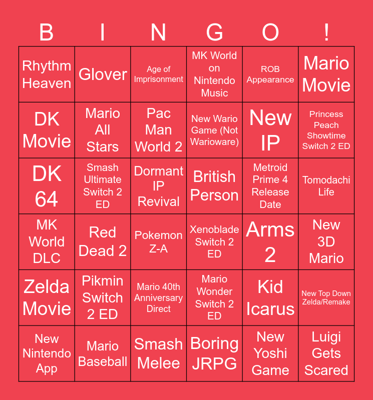 This bingo card has 36 words: MK World DLC, Red Dead 2, Smash Melee, New Wario Game (Not Warioware), Metroid Prime 4 Release Date, Tomodachi Life, Rhythm Heaven, Mario Baseball, Age of Imprisonment, Mario Wonder Switch 2 ED, New IP, Mario Movie, Zelda Movie, Smash Ultimate Switch 2 ED, Pac Man World 2, MK World on Nintendo Music, Kid Icarus, New 3D Mario, DK Movie, Mario All Stars, Pokemon Z-A, Xenoblade Switch 2 ED, Arms 2, New Top Down Zelda/Remake, DK 64, Glover, Dormant IP Revival, Boring JRPG, ROB Appearance, Princess Peach Showtime Switch 2 ED, New Nintendo App, Pikmin Switch 2 ED, Mario 40th Anniversary Direct, British Person, New Yoshi Game and Luigi Gets Scared.