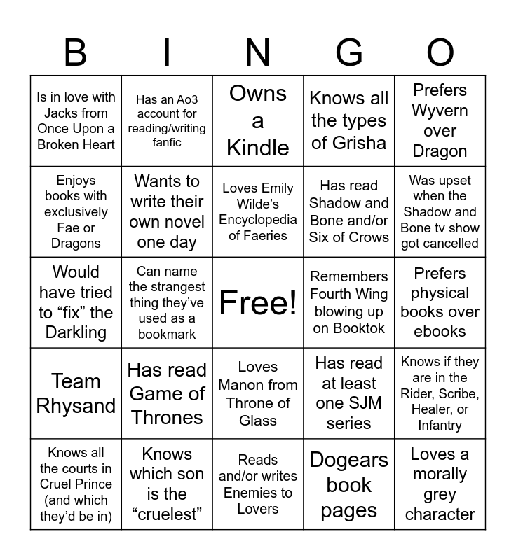 This bingo card has a free space and 27 words: Has read at least one SJM series, Has read the Cruel Prince/The Folk of the Air series, Has read Shadow and Bone and/or Six of Crows, Reads and/or writes Enemies to Lovers, Enjoys books with exclusively Fae or Dragons, Owns a Kindle, Has an Ao3 account for reading/writing fanfic, Team Rhysand, Remembers Fourth Wing blowing up on Booktok, Knows if they are in the Rider, Scribe, Healer, or Infantry, Would have tried to “fix” the Darkling, Knows all the types of Grisha, Knows all the courts in Cruel Prince (and which they’d be in), Knows which son is the “cruelest”, Was upset when the Shadow and Bone tv show got cancelled, Finished Priory of the Orange Tree, Wants to write their own novel one day, Loves Emily Wilde’s Encyclopedia of Faeries, Has read Game of Thrones, Is in love with Jacks from Once Upon a Broken Heart, Prefers physical books over ebooks, Dogears book pages, Can name the strangest thing they’ve used as a bookmark, Loves a morally grey character, Loves Manon from Throne of Glass, Prefers Wyvern over Dragon and Had a favorite character die.