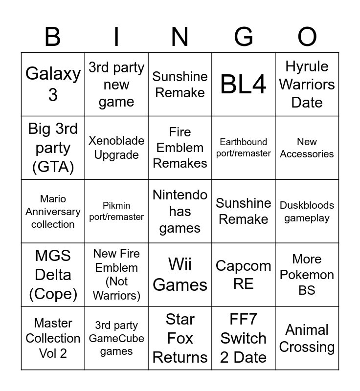 This bingo card has a free space and 24 words: New Fire Emblem (Not Warriors), 3rd party GameCube games, Fire Emblem Remakes, Master Collection Vol 2, Hyrule Warriors Date, Galaxy 3, Big 3rd party (GTA), 3rd party new game, Sunshine Remake, Wii Games, Earthbound port/remaster, Mario Anniversary collection, Capcom RE, More Pokemon BS, Xenoblade Upgrade, FF7 Switch 2 Date, Duskbloods gameplay, Sunshine Remake, New Accessories, Pikmin port/remaster, Animal Crossing, MGS Delta (Cope), BL4 and Star Fox Returns.