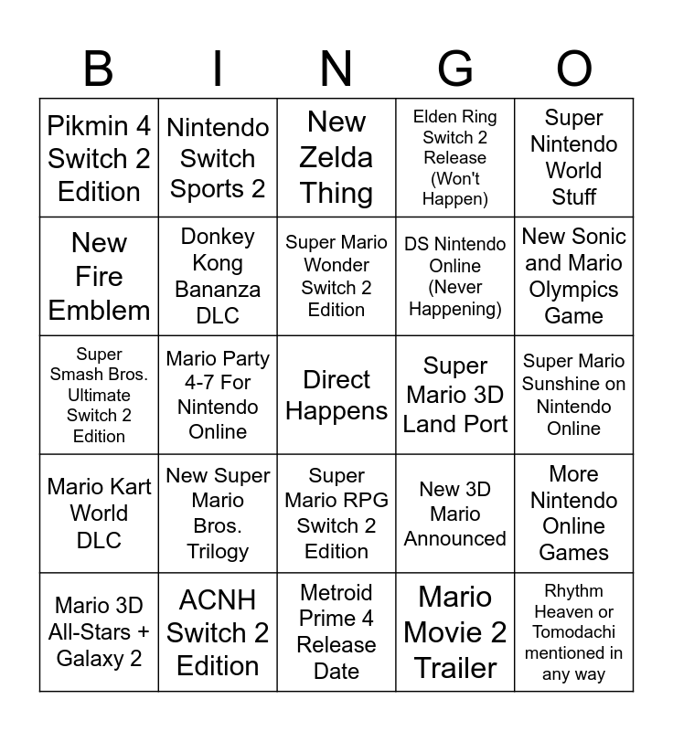 This bingo card has a free space and 24 words: Mario 3D All-Stars + Galaxy 2, New Super Mario Bros. Trilogy, Super Mario Wonder Switch 2 Edition, Mario Movie 2 Trailer, Super Nintendo World Stuff, Pikmin 4 Switch 2 Edition, Nintendo Switch Sports 2, New Zelda Thing, Super Mario 3D Land Port, Super Mario Sunshine on Nintendo Online, Super Smash Bros. Ultimate Switch 2 Edition, Donkey Kong Bananza DLC, New 3D Mario Announced, More Nintendo Online Games, New Fire Emblem, ACNH Switch 2 Edition, Metroid Prime 4 Release Date, Elden Ring Switch 2 Release (Won't Happen), New Sonic and Mario Olympics Game, Mario Kart World DLC, Mario Party 4-7 For Nintendo Online, Super Mario RPG Switch 2 Edition, DS Nintendo Online (Never Happening) and Rhythm Heaven or Tomodachi mentioned in any way.