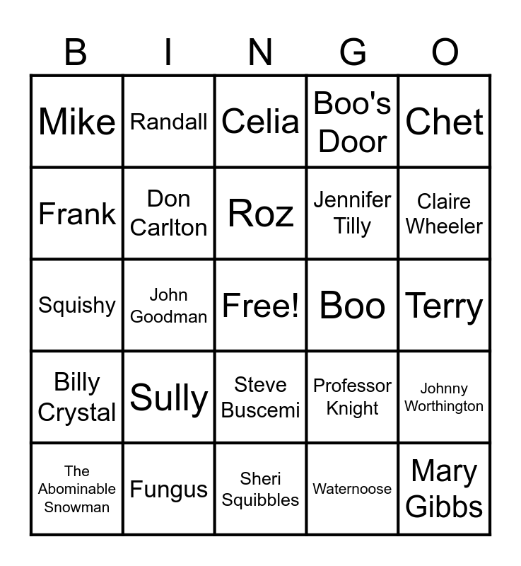 This bingo card has a free space and 24 words: The Abominable Snowman, Sully, Roz, Waternoose, Chet, Mike, Randall, Celia, Boo, Terry, Squishy, Don Carlton, Professor Knight, Johnny Worthington, Frank, Fungus, Sheri Squibbles, Boo's Door, Claire Wheeler, Billy Crystal, John Goodman, Steve Buscemi, Jennifer Tilly and Mary Gibbs.