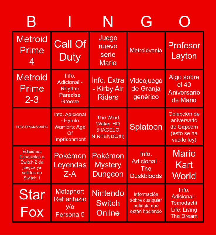 This bingo card has 25 words: Pokémon Leyendas Z-A, Nintendo Switch Online, Info. Extra - Kirby Air Riders, Star Fox, Profesor Layton, Metroid Prime 4, Metroid Prime 2-3, Call Of Duty, Splatoon, Pokémon Mystery Dungeon, Videojuego de Granja genérico, RPG/JRPG/MMORPG, Info. Adicional - The Duskbloods, Mario Kart World, Info. Adicional - Rhythm Paradise Groove, Info. Adicional - Tomodachi Life: Living The Dream, Colección de aniversario de Capcom (esto se ha vuelto ley), Juego nuevo serie Mario, Algo sobre el 40 Aniversario de Mario, Info. Adicional - Hyrule Warriors: Age Of Imprisonment, The Wind Waker HD (HACELO NINTENDO!!!), Metaphor: ReFantazio y/o Persona 5, Ediciones Especiales a Switch 2 de juegos ya salidos en Switch 1, Metroidvania and Información sobre cualquier película que estén haciendo.