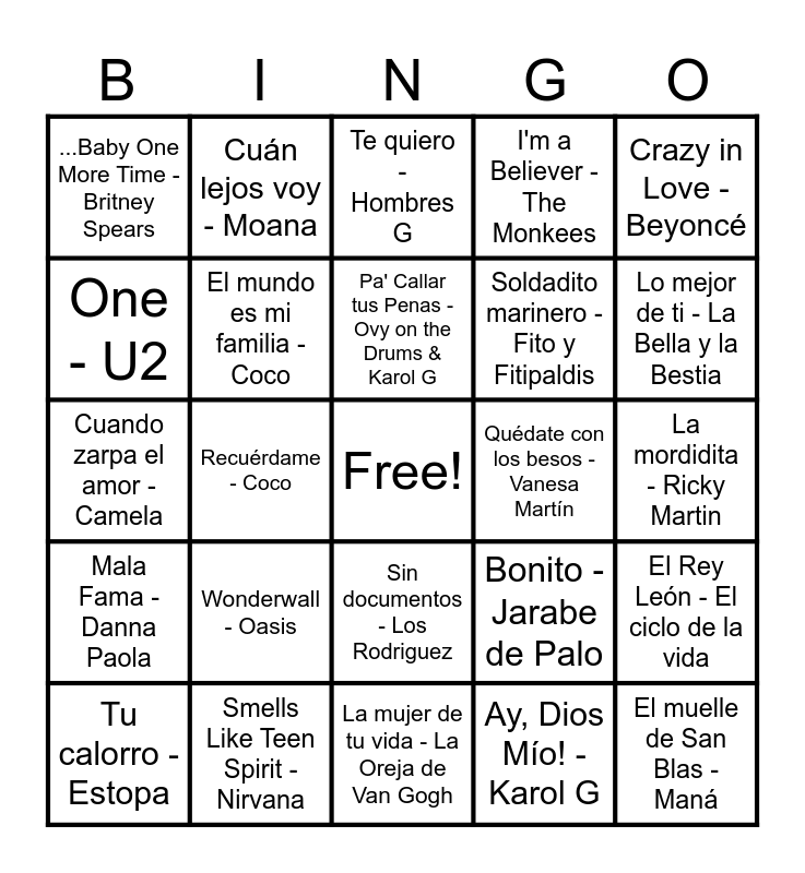 This bingo card has a free space and 25 words: Wonderwall - Oasis, La mujer de tu vida - La Oreja de Van Gogh, Pa' Callar tus Penas - Ovy on the Drums & Karol G, Tu calorro - Estopa, Crazy in Love - Beyoncé, ...Baby One More Time - Britney Spears, One - U2, Cuán lejos voy - Moana, Quédate con los besos - Vanesa Martín, Sin documentos - Los Rodriguez, Soldadito marinero - Fito y Fitipaldis, Cuando zarpa el amor - Camela, Bonito - Jarabe de Palo, El Rey León - El ciclo de la vida, El mundo es mi familia - Coco, Y cómo es él - Marc Anthony, La mordidita - Ricky Martin, Te quiero - Hombres G, Lo mejor de ti - La Bella y la Bestia, Recuérdame - Coco, El muelle de San Blas - Maná, Smells Like Teen Spirit - Nirvana, Mala Fama - Danna Paola, I'm a Believer - The Monkees and Ay, Dios Mío! - Karol G.