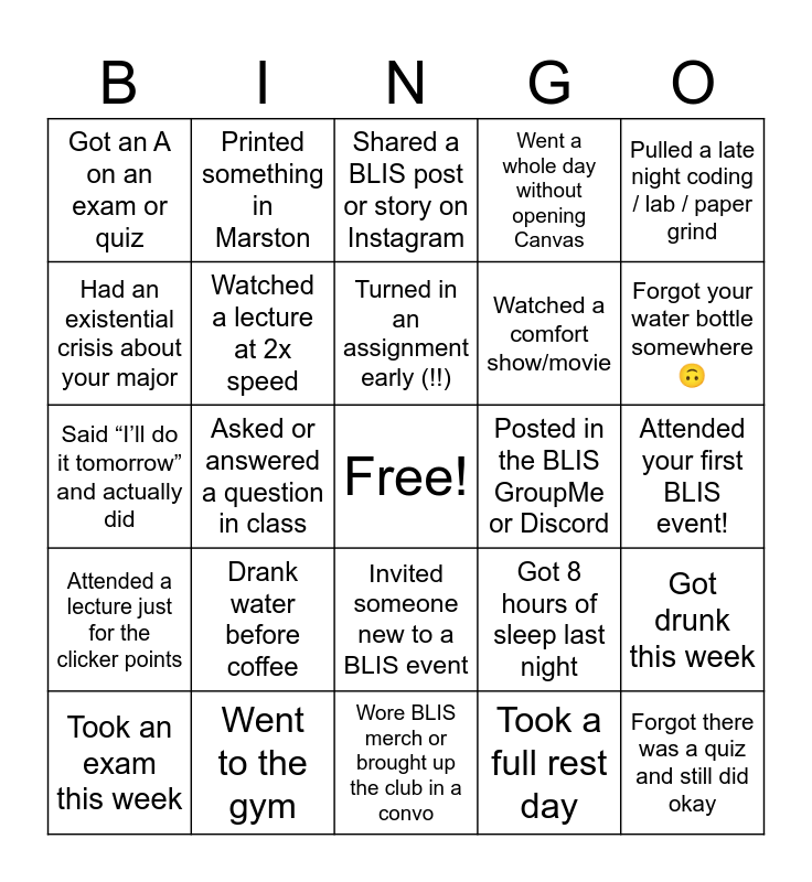 This bingo card has a free space and 24 words: Drank water before coffee, Went to the gym, Turned in an assignment early (!!), Took an exam this week, Pulled a late night coding / lab / paper grind, Got an A on an exam or quiz, Had an existential crisis about your major, Printed something in Marston, Posted in the BLIS GroupMe or Discord, Invited someone new to a BLIS event, Watched a comfort show/movie, Said “I’ll do it tomorrow” and actually did, Got 8 hours of sleep last night, Got drunk this week, Watched a lecture at 2x speed, Took a full rest day, Attended your first BLIS event!, Shared a BLIS post or story on Instagram, Forgot your water bottle somewhere 🙃, Asked or answered a question in class, Forgot there was a quiz and still did okay, Attended a lecture just for the clicker points, Went a whole day without opening Canvas and Wore BLIS merch or brought up the club in a convo.