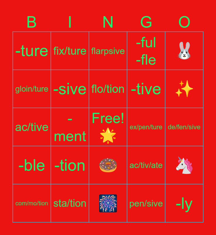 This bingo card has a free space and 24 words: -tion, sta/tion, flo/tion, com/mo/tion, 🐰, -ture, gloin/ture, fix/ture, ex/pen/ture, 🍩, -tive, ac/tive, ac/tiv/ate, 🦄, -sive, pen/sive, de/fen/sive, flarpsive, ✨, -ment, -ly, -ble, -ful -fle and 🎆.