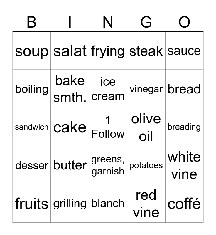 This bingo card has a free space and 24 words: butter, grilling, ice cream, fruits, sauce, soup, boiling, salat, olive oil, greens, garnish, vinegar, sandwich, potatoes, white vine, bake smth., red vine, breading, frying, bread, cake, coffé, desser, steak and blanch.