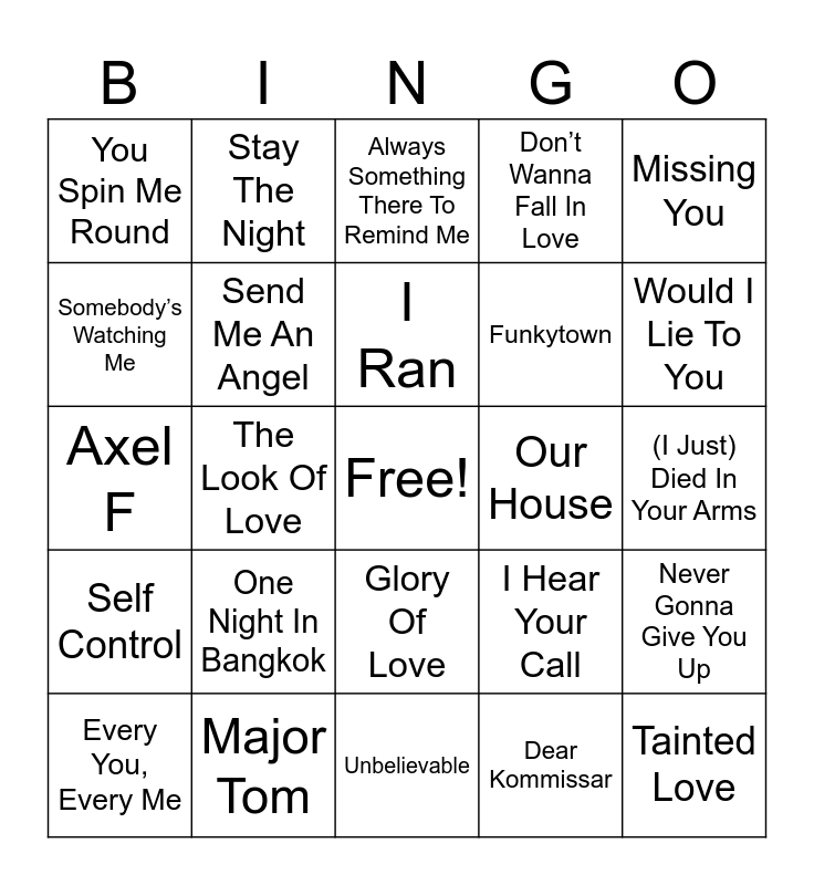 This bingo card has a free space and 60 words: Love Is All Around, Major Tom, Voices Carry, Self Control, Dear Kommissar, Tarzan Boy, Send Me An Angel, Bette Davis Eyes, Funkytown, Sunglasses At Night, Don’t Wanna Fall In Love, Let’s Hear It For The Boy, Somebody’s Watching Me, The Safety Dance, Walking On Sunshine, You Spin Me Round, Tainted Love, Missing You, Whip It, I Ran, Our House, Always Something There To Remind Me, Every You, Every Me, Never Gonna Give You Up, I Like Chopin, The Power Of Love, Wildflower, Eye Of The Tiger, Would I Lie To You, The Captain of Her Heart, Drive, War, Over My Shoulder, Two Princes, Stay The Night, St Elmo’s Fire, Relax, The Look Of Love, Don’t Worry, Be Happy, Axel F, Take My Breath Away, One Night In Bangkok, (I Just) Died In Your Arms, 99 Red Balloons, I Hear Your Call, The Promise, Drivers Seat, Wonderful Life, Video Killed The Radio Star, Glory Of Love, Unbelievable, Tubthumping, Groove Is In The Heart, Lady Marmalade, Save Tonight, You Get What You Give, What’s Up, There She Goes, Save Me and Closing Time.