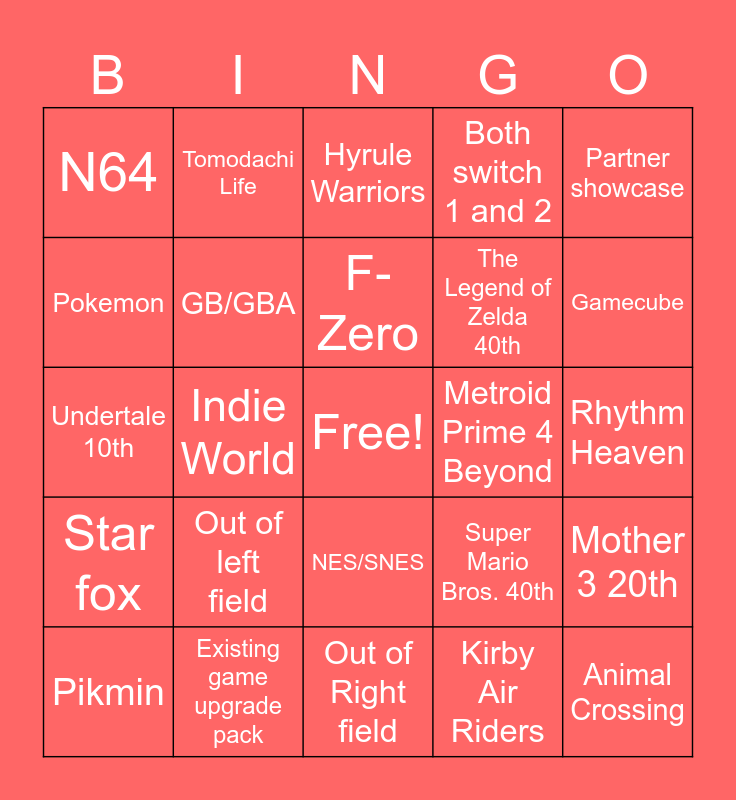 This bingo card has a free space and 24 words: Out of left field, Existing game upgrade pack, F-Zero, Pikmin, Partner showcase, N64, Pokemon, Tomodachi Life, Metroid Prime 4 Beyond, NES/SNES, The Legend of Zelda 40th, Undertale 10th, Super Mario Bros. 40th, Mother 3 20th, GB/GBA, Kirby Air Riders, Rhythm Heaven, Hyrule Warriors, Gamecube, Indie World, Animal Crossing, Star fox, Both switch 1 and 2 and Out of Right field.