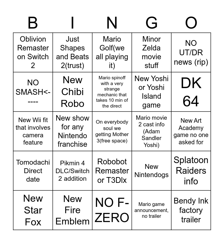 This bingo card has a free space and 24 words: Pikmin 4 DLC/Switch 2 addition, New Fire Emblem, Mario spinoff with a very strange mechanic that takes 10 min of the direct, New Star Fox, NO UT/DR news (rip), Oblivion Remaster on Switch 2, NO SMASH<-----, Just Shapes and Beats 2(trust), Mario movie 2 cast info (Adam Sandler Yoshi), Robobot Remaster or T3Dlx, New Yoshi or Yoshi Island game, New Wii fit that involves camera feature, New Nintendogs, Splatoon Raiders info, New Chibi Robo, Mario game announcement, no trailer, New Art Academy game no one asked for, Mario Golf(we all playing it), DK 64, New show for any Nintendo franchise, Bendy Ink factory trailer, Tomodachi Direct date, Minor Zelda movie stuff and NO F-ZERO.