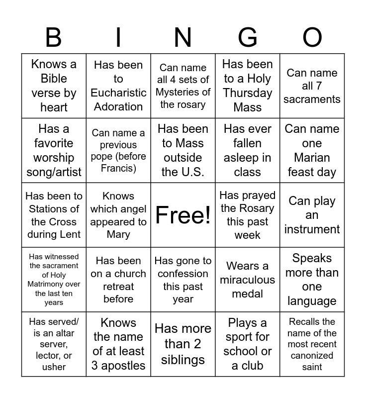 This bingo card has a free space and 24 words: Has been on a church retreat before, Knows the name of at least 3 apostles, Has been to Mass outside the U.S., Has served/ is an altar server, lector, or usher, Can name all 7 sacraments, Knows a Bible verse by heart, Has a favorite worship song/artist, Has been to Eucharistic Adoration, Has prayed the Rosary this past week, Has gone to confession this past year, Has ever fallen asleep in class, Has been to Stations of the Cross during Lent, Wears a miraculous medal, Speaks more than one language, Can name a previous pope (before Francis), Plays a sport for school or a club, Can play an instrument, Can name all 4 sets of Mysteries of the rosary, Can name one Marian feast day, Knows which angel appeared to Mary, Recalls the name of the most recent canonized saint, Has witnessed the sacrament of Holy Matrimony over the last ten years, Has been to a Holy Thursday Mass and Has more than 2 siblings.