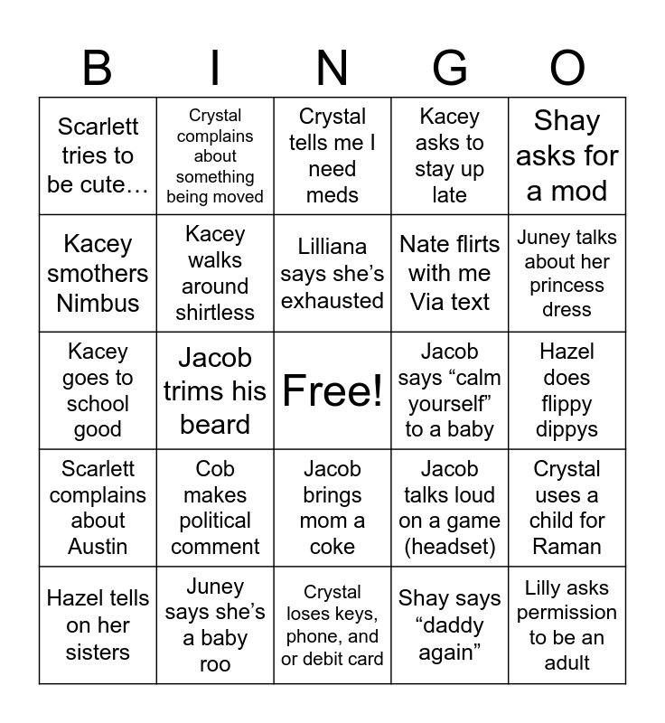 This bingo card has a free space and 24 words: Cob makes political comment, Juney says she’s a baby roo, Lilliana says she’s exhausted, Hazel tells on her sisters, Shay asks for a mod, Scarlett tries to be cute…, Kacey smothers Nimbus, Crystal complains about something being moved, Jacob says “calm yourself” to a baby, Jacob brings mom a coke, Nate flirts with me Via text, Kacey goes to school good, Jacob talks loud on a game (headset), Crystal uses a child for Raman, Kacey walks around shirtless, Shay says “daddy again”, Hazel does flippy dippys, Crystal tells me I need meds, Juney talks about her princess dress, Jacob trims his beard, Lilly asks permission to be an adult, Scarlett complains about Austin, Kacey asks to stay up late and Crystal loses keys, phone, and or debit card.