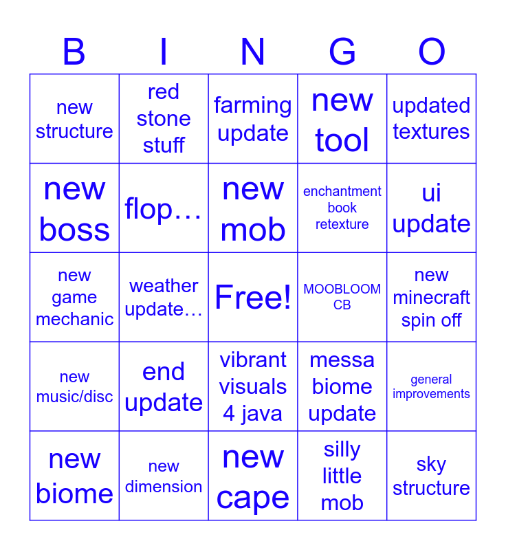 This bingo card has a free space and 24 words: end update, new dimension, new mob, new biome, updated textures, new structure, new boss, red stone stuff, MOOBLOOM CB, vibrant visuals 4 java, enchantment book retexture, new game mechanic, messa biome update, general improvements, flop…, silly little mob, new minecraft spin off, farming update, ui update, weather update…, sky structure, new music/disc, new tool and new cape.