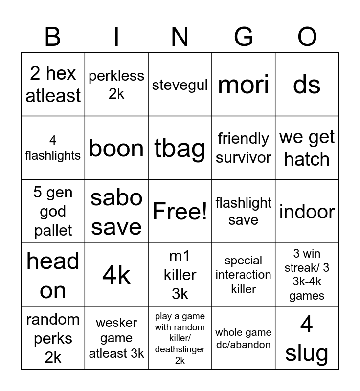 This bingo card has a free space and 24 words: 4k, wesker game atleast 3k, tbag, random perks 2k, ds, 2 hex atleast, 4 flashlights, perkless 2k, flashlight save, m1 killer 3k, friendly survivor, 5 gen god pallet, special interaction killer, 3 win streak/ 3 3k-4k games, boon, whole game dc/abandon, indoor, stevegul, we get hatch, sabo save, 4 slug, head on, mori and play a game with random killer/ deathslinger 2k.