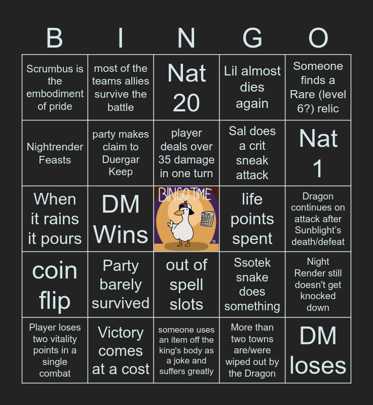 This bingo card has a free space and 24 words: Party barely survived, Victory comes at a cost, player deals over 35 damage in one turn, Player loses two vitality points in a single combat, Someone finds a Rare (level 6?) relic, Scrumbus is the embodiment of pride, Nightrender Feasts, most of the teams allies survive the battle, life points spent, out of spell slots, Sal does a crit sneak attack, When it rains it pours, Ssotek snake does something, Night Render still doesn't get knocked down, party makes claim to Duergar Keep, More than two towns are/were wiped out by the Dragon, Dragon continues on attack after Sunblight’s death/defeat, Nat 20, Nat 1, DM Wins, DM loses, coin flip, Lil almost dies again and someone uses an item off the king's body as a joke and suffers greatly.