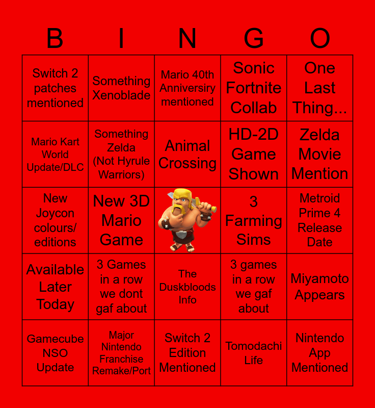 This bingo card has a free space and 24 words: 3 Games in a row we dont gaf about, Major Nintendo Franchise Remake/Port, Animal Crossing, Gamecube NSO Update, One Last Thing..., Switch 2 patches mentioned, Mario Kart World Update/DLC, Something Xenoblade, 3 Farming Sims, The Duskbloods Info, HD-2D Game Shown, New Joycon colours/ editions, 3 games in a row we gaf about, Miyamoto Appears, Something Zelda (Not Hyrule Warriors), Tomodachi Life, Metroid Prime 4 Release Date, Mario 40th Anniversiry mentioned, Zelda Movie Mention, New 3D Mario Game, Nintendo App Mentioned, Available Later Today, Sonic Fortnite Collab and Switch 2 Edition Mentioned.