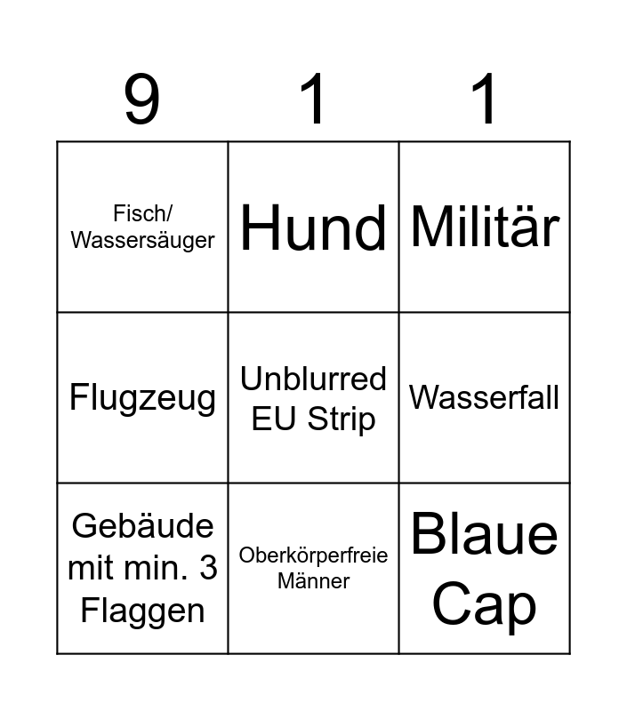 This bingo card has a free space and 8 words: Wasserfall, Militär, Hund, Gebäude mit min. 3 Flaggen, Fisch/ Wassersäuger, Blaue Cap, Flugzeug and Oberkörperfreie Männer.