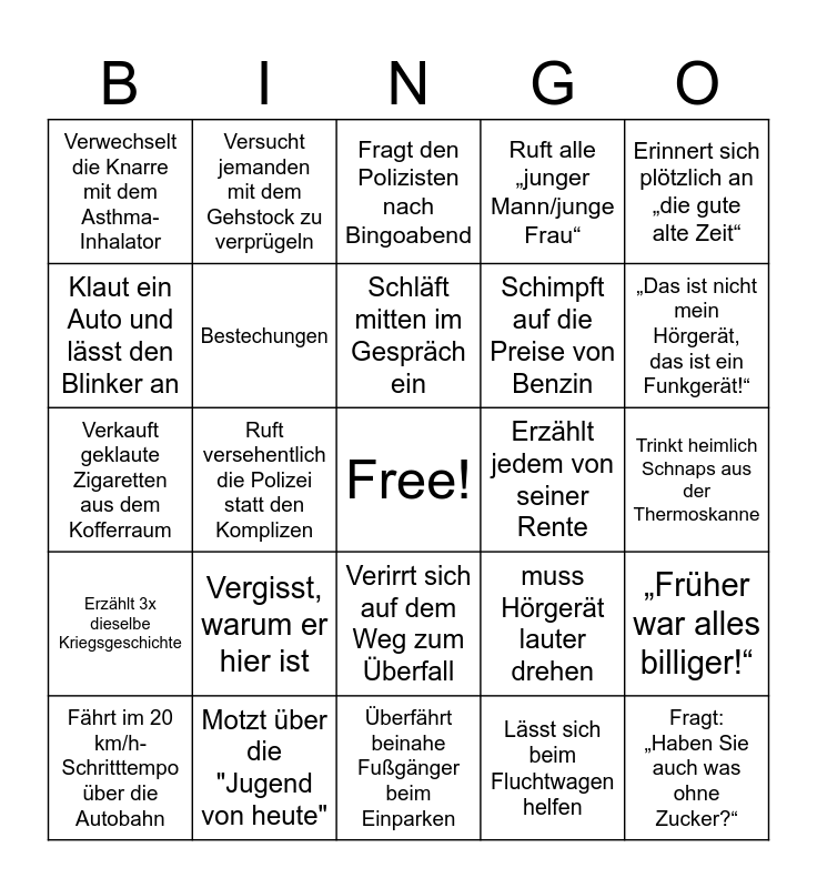 This bingo card has a free space and 24 words: Vergisst, warum er hier ist, Motzt über die "Jugend von heute", Schläft mitten im Gespräch ein, Fährt im 20 km/h-Schritttempo über die Autobahn, Erinnert sich plötzlich an „die gute alte Zeit“, Verwechselt die Knarre mit dem Asthma-Inhalator, Klaut ein Auto und lässt den Blinker an, Versucht jemanden mit dem Gehstock zu verprügeln, Erzählt jedem von seiner Rente, Verirrt sich auf dem Weg zum Überfall, Schimpft auf die Preise von Benzin, Verkauft geklaute Zigaretten aus dem Kofferraum, muss Hörgerät lauter drehen, „Früher war alles billiger!“, Bestechungen, Lässt sich beim Fluchtwagen helfen, Trinkt heimlich Schnaps aus der Thermoskanne, Fragt den Polizisten nach Bingoabend, „Das ist nicht mein Hörgerät, das ist ein Funkgerät!“, Ruft versehentlich die Polizei statt den Komplizen, Fragt: „Haben Sie auch was ohne Zucker?“, Erzählt 3x dieselbe Kriegsgeschichte, Ruft alle „junger Mann/junge Frau“ and Überfährt beinahe Fußgänger beim Einparken.