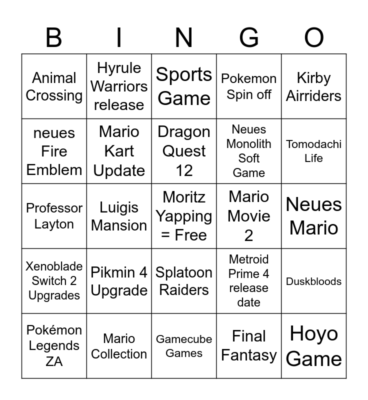 This bingo card has a free space and 24 words: Pikmin 4 Upgrade, Mario Collection, Dragon Quest 12, Pokémon Legends ZA, Kirby Airriders, Animal Crossing, neues Fire Emblem, Hyrule Warriors release, Mario Movie 2, Splatoon Raiders, Neues Monolith Soft Game, Professor Layton, Metroid Prime 4 release date, Duskbloods, Mario Kart Update, Final Fantasy, Neues Mario, Sports Game, Tomodachi Life, Luigis Mansion, Hoyo Game, Xenoblade Switch 2 Upgrades, Pokemon Spin off and Gamecube Games.