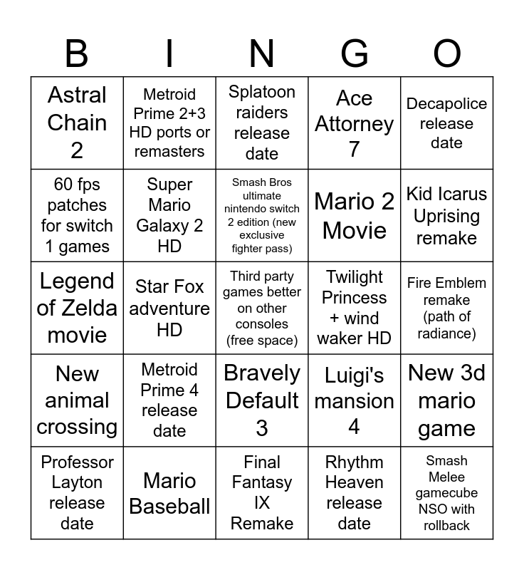This bingo card has a free space and 24 words: Metroid Prime 4 release date, Mario Baseball, Smash Bros ultimate nintendo switch 2 edition (new exclusive fighter pass), Professor Layton release date, Decapolice release date, Astral Chain 2, 60 fps patches for switch 1 games, Metroid Prime 2+3 HD ports or remasters, Twilight Princess + wind waker HD, Bravely Default 3, Mario 2 Movie, Legend of Zelda movie, Luigi's mansion 4, New 3d mario game, Super Mario Galaxy 2 HD, Rhythm Heaven release date, Fire Emblem remake (path of radiance), Splatoon raiders release date, Kid Icarus Uprising remake, Star Fox adventure HD, Smash Melee gamecube NSO with rollback, New animal crossing, Ace Attorney 7 and Final Fantasy IX Remake.