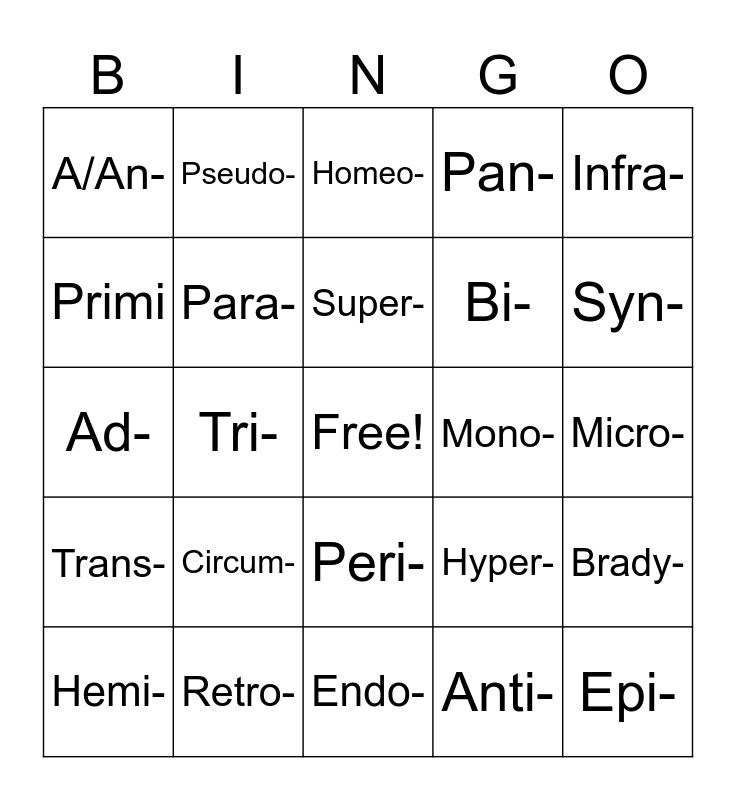 This bingo card has a free space and 29 words: Hemi-, Hypo-, Tri-, Ab-, A/An-, Homeo-, Para-, Circum-, Mono-, Retro-, Micro-, Epi-, Endo-, Anti-, Syn-, Tachy-, Peri-, Trans-, Infra-, Ad-, Hyper-, Post-, Bi-, Primi, Pan-, Pseudo-, Brady-, Super- and Ultra-.