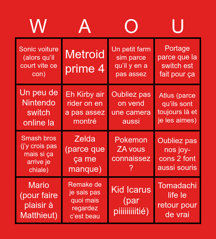 This bingo card has 16 words: Remake de je sais pas quoi mais regardez c’est beau, Oubliez pas nos joy-cons 2 font aussi souris, Un petit farm sim parce qu’il y en a pas assez, Sonic voiture (alors qu’il court vite ce con), Smash bros (j’y crois pas mais si ça arrive je chiale), Metroid prime 4, Pokemon ZA vous connaissez ?, Kid Icarus (par piiiiiiiiitié), Un peu de Nintendo switch online la, Eh Kirby air rider on en a pas assez montré, Mario (pour faire plaisir à Matthieut), Portage parce que la switch est fait pour ça, Zelda (parce que ça me manque), Atlus (parce qu’ils sont toujours là et je les aimes), Oubliez pas on vend une camera aussi and Tomadachi life le retour pour de vrai.