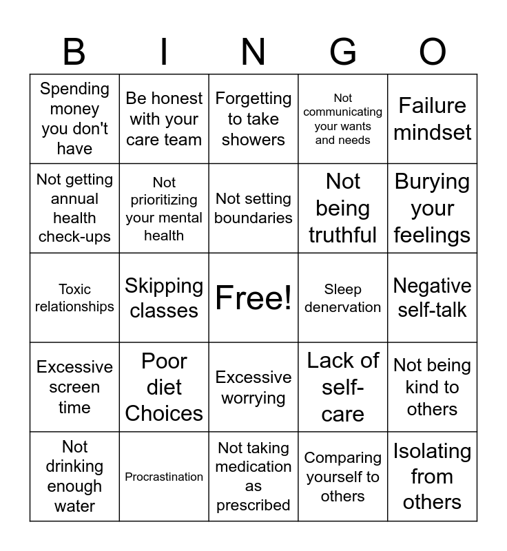 This bingo card has a free space and 29 words: Not drinking enough water, Lack of physical activity, Skipping classes, Not cleaning your room, Spending money you don't have, Forgetting to take showers, Not prioritizing your mental health, Poor diet Choices, Sleep denervation, Procrastination, Negative self-talk, Isolating from others, Not taking medication as prescribed, Comparing yourself to others, Burying your feelings, Chronic stress, Excessive worrying, Excessive screen time, Failure mindset, Toxic relationships, Lack of self-care, Regret, Not being truthful, Not getting annual health check-ups, Not communicating your wants and needs, Be honest with your care team, Not being kind to others, Not setting boundaries and Expressing your needs.