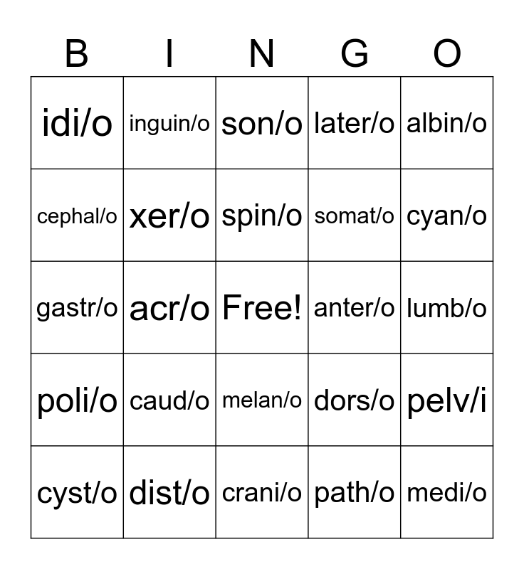 This bingo card has a free space and 29 words: cyst/o, ventr/o, acr/o, hist/o, idi/o, son/o, xer/o, caud/o, anter/o, dist/o, lumb/o, medi/o, crani/o, path/o, cyan/o, leuk/o, melan/o, poli/o, albin/o, gastr/o, dors/o, proxim/o, somat/o, cephal/o, later/o, inguin/o, pelv/i, spin/o and eti/o.