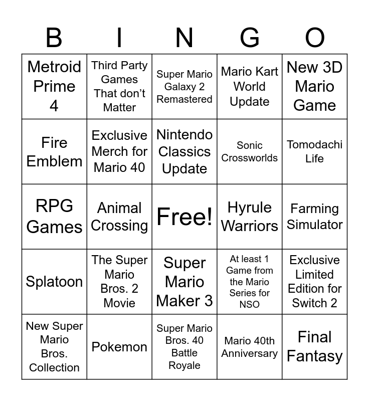 This bingo card has a free space and 24 words: New Super Mario Bros. Collection, The Super Mario Bros. 2 Movie, Nintendo Classics Update, Mario 40th Anniversary, New 3D Mario Game, Metroid Prime 4, Third Party Games That don’t Matter, Super Mario Galaxy 2 Remastered, Hyrule Warriors, Farming Simulator, RPG Games, Exclusive Merch for Mario 40, At least 1 Game from the Mario Series for NSO, Exclusive Limited Edition for Switch 2, Fire Emblem, Pokemon, Super Mario Bros. 40 Battle Royale, Mario Kart World Update, Tomodachi Life, Splatoon, Animal Crossing, Super Mario Maker 3, Sonic Crossworlds and Final Fantasy.