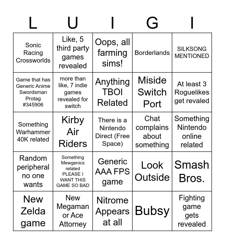 This bingo card has a free space and 32 words: Bubsy, IMSCARED ported to switch (Not happening), Kirby Air Riders, Random new Nintendo game shadow dropped mid direct, Random peripheral no one wants, more than like, 7 indie games revealed for switch, SILKSONG MENTIONED, Smash Bros., Like, 5 third party games revealed, New Super Mario Bros, Anything TBOI Related, Oops, all farming sims!, Game that was revealed in the direct launches the same day as the direct, Bethesda appears, Chat complains about something, A rhythm game appears, New Zelda game, Something Warhammer 40K related, Generic AAA FPS game, Something Mewgenics related PLEASE I WANT THIS GAME SO BAD, Look Outside, Stick it to the stickman switch release, Something Nintendo online related, New Megaman or Ace Attorney, Fighting game gets revealed, Borderlands, Miside Switch Port, Game that has Generic Anime Swordsman Protag #345906, Sonic Racing Crossworlds, Nitrome Appears at all, Enter the Gungeon 2 News and At least 3 Roguelikes get revaled.