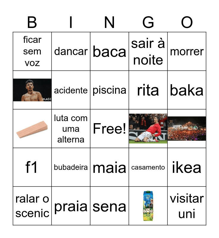 This bingo card has 5 images, a free space and 19 words: bubadeira, praia, piscina, ralar o scenic, morrer, ficar sem voz, dancar, maia, rita, casamento, ikea, acidente, baca, baka, luta com uma alterna, visitar uni, f1, sair à noite and sena.