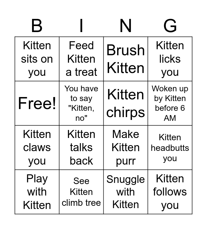 This bingo card has 16 words: See Kitten climb tree, Kitten headbutts you, Brush Kitten, Kitten sits on you, Kitten claws you, Feed Kitten a treat, Make Kitten purr, Snuggle with Kitten, Free!, You have to say "Kitten, no", Play with Kitten, Kitten licks you, Kitten talks back, Woken up by Kitten before 6 AM, Kitten chirps and Kitten follows you.
