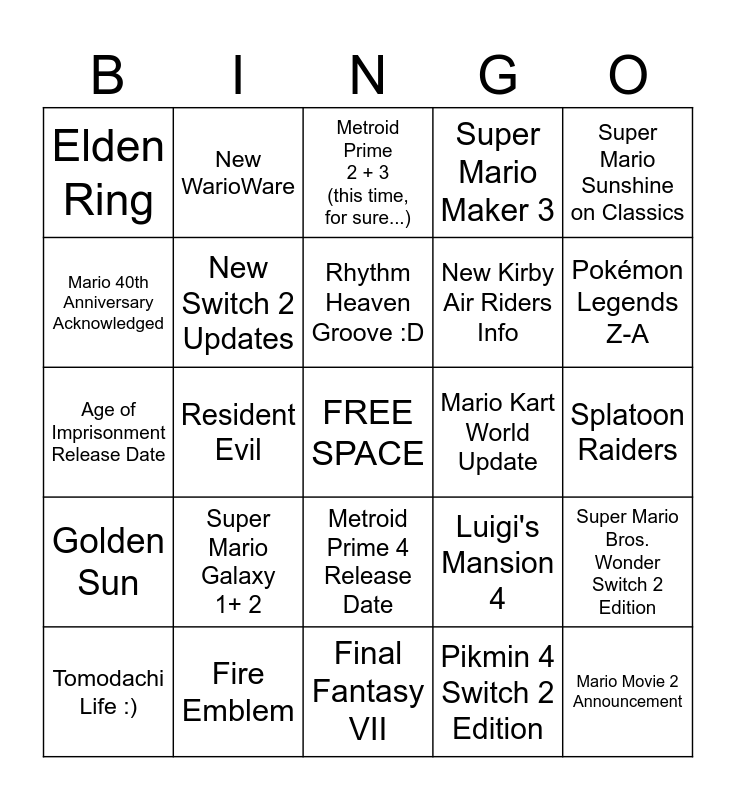 This bingo card has a free space and 24 words: Super Mario Galaxy 1+ 2, Fire Emblem, Rhythm Heaven Groove :D, Tomodachi Life :), Super Mario Sunshine on Classics, Elden Ring, Mario 40th Anniversary Acknowledged, New WarioWare, Mario Kart World Update, Metroid Prime 4 Release Date, New Kirby Air Riders Info, Age of Imprisonment Release Date, Luigi's Mansion 4, Super Mario Bros. Wonder Switch 2 Edition, New Switch 2 Updates, Pikmin 4 Switch 2 Edition, Splatoon Raiders, Metroid Prime 2 + 3 (this time, for sure...), Pokémon Legends Z-A, Resident Evil, Mario Movie 2 Announcement, Golden Sun, Super Mario Maker 3 and Final Fantasy VII.