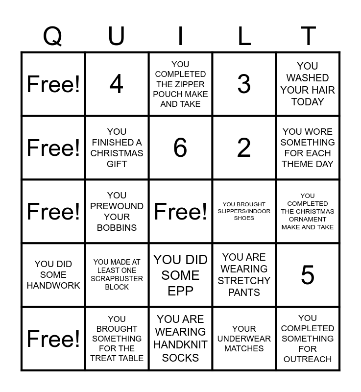 This bingo card has a free space and 29 words: Free!, YOU LUGGED A MUG, YOU PREWOUND YOUR BOBBINS, YOU FINISHED A HALLOWEEN PROJECT, Free!, YOU COMPLETED THE ZIPPER POUCH MAKE AND TAKE, YOU FINISHED A CHRISTMAS GIFT, YOU MADE AT LEAST ONE SCRAPBUSTER BLOCK, YOU BROUGHT SLIPPERS/INDOOR SHOES, YOU BROUGHT SOMETHING FOR THE TREAT TABLE, YOU COMPLETED THE CHRISTMAS ORNAMENT MAKE AND TAKE, YOU COMPLETED SOMETHING FOR OUTREACH, YOU ARE WEARING HANDKNIT SOCKS, YOUR UNDERWEAR MATCHES, YOU WORE SOMETHING FOR EACH THEME DAY, YOU DID SOME PAPERPIECING, YOU DID SOME EPP, YOU DID SOME HANDWORK, YOU WASHED YOUR HAIR TODAY, Free!, YOU ARE WEARING STRETCHY PANTS, 1, 2, Free!, 3, 4, 5, 6 and 7.