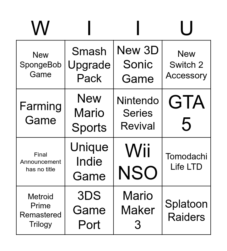 This bingo card has 16 words: 3DS Game Port, Tomodachi Life LTD, New 3D Sonic Game, New SpongeBob Game, Final Announcement has no title, Smash Upgrade Pack, Wii NSO, Mario Maker 3, Farming Game, New Mario Sports, Metroid Prime Remastered Trilogy, New Switch 2 Accessory, Unique Indie Game, GTA 5, Nintendo Series Revival and Splatoon Raiders.