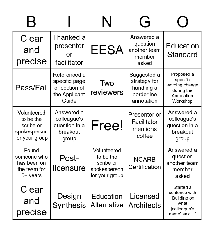 This bingo card has a free space and 74 words: Three Critical Elements, Applicant's Explanation, EESA, Education Alternative, Design Synthesis, Building Technology, Professional Practice, Liberal Arts Waiver, Clear and precise, Architectural critique, Post-licensure, Completed or built in a U.S. jurisdiction, Two reviewers, Pass/Fail, Asked a clarifying question during a workshop, Answered a colleague's question in a breakout group, Shared a relevant experience from a past review, Proposed a specific wording change during the Annotation Workshop, Used the phrase "actionable feedback", Volunteered to be the scribe or spokesperson for your group, Referenced a specific page or section of the Applicant Guide, Thanked a presenter or facilitator, Answered a question another team member asked, Suggested a strategy for handling a borderline annotation, Started a sentence with "Building on what [colleague's name] said...", Found someone who has been on the team for 5+ years, Learned something new about a colleague during a break, Presenter or Facilitator mentions coffee, Answered a question another team member asked, Shared an idea for documentation for an exhibit, Education Standard, NCARB Certification, Found someone on the committee who has been on the committee for 1 year, Learning by Experience, Competency, Licensed Architects, Approximation of a degree from a NAAB accredited program, Three Critical Elements, Applicant's Explanation, EESA, Education Alternative, Design Synthesis, Building Technology, Professional Practice, Liberal Arts Waiver, Clear and precise, Architectural critique, Post-licensure, Completed or built in a U.S. jurisdiction, Two reviewers, Pass/Fail, Asked a clarifying question during a workshop, Answered a colleague's question in a breakout group, Shared a relevant experience from a past review, Proposed a specific wording change during the Annotation Workshop, Used the phrase "actionable feedback", Volunteered to be the scribe or spokesperson for your group, Referenced a specific page or section of the Applicant Guide, Thanked a presenter or facilitator, Answered a question another team member asked, Suggested a strategy for handling a borderline annotation, Started a sentence with "Building on what [colleague's name] said...", Found someone who has been on the team for 5+ years, Learned something new about a colleague during a break, Presenter or Facilitator mentions coffee, Answered a question another team member asked, Shared an idea for documentation for an exhibit, Education Standard, NCARB Certification, Found someone on the committee who has been on the committee for 1 year, Learning by Experience, Competency, Licensed Architects and Approximation of a degree from a NAAB accredited program.
