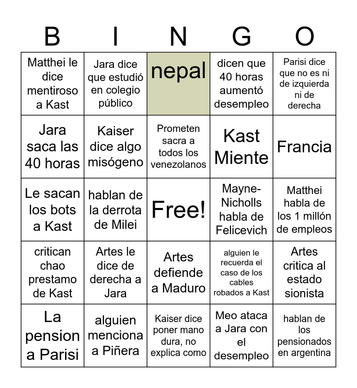 This bingo card has a free space and 24 words: Artes le dice de derecha a Jara, alguien menciona a Piñera, Prometen sacra a todos los venezolanos, La pension a Parisi, Parisi dice que no es ni de izquierda ni de derecha, Matthei le dice mentiroso a Kast, Jara saca las 40 horas, Jara dice que estudió en colegio público, Mayne-Nicholls habla de Felicevich, Artes defiende a Maduro, Kast Miente, Le sacan los bots a Kast, alguien le recuerda el caso de los cables robados a Kast, Artes critica al estado sionista, Kaiser dice algo misógeno, Meo ataca a Jara con el desempleo, Matthei habla de los 1 millón de empleos, nepal, Francia, hablan de la derrota de Milei, hablan de los pensionados en argentina, critican chao prestamo de Kast, dicen que 40 horas aumentó desempleo and Kaiser dice poner mano dura, no explica como.
