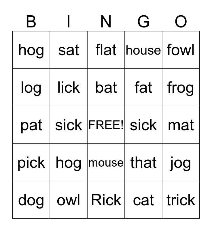 This bingo card has a free space and 26 words: mouse, cat, bat, owl, fowl, hog, log, sat, mat, that, fat, pat, jog, dog, sick, kick, house, pick, flat, trick, frog, Rick, sick, hog, lick and stick.