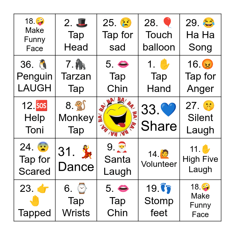This bingo card has a free space and 36 words: 26. Demo Points, 17.ποΈ Participate, 32. π Toss a ball, 7.π¦Tarzan Tap, 14.π Volunteer, 24. π¨ Tap for Scared, 5. π Tap Chin, 4 . π Tap Under Nose, 29. πHa Ha Song, 30. π€Shake Hands, 8.πMonkey Tap, 28. πTouch balloon, 10.π Clap, 33.π Share, 16.π‘ Tap for Anger, 18.π€ͺ Make Funny Face, 15.π€ Give Self a Hug, 31. π Dance, 18.π€ͺ Make Funny Face, 25. π’ Tap for sad, 27. π€« Silent Laugh, 11.β High Five Laugh, 6. β Tap Wrists, 23. ππ€ Tapped, 5. π Tap Chin, 2. π© Tap Head, 12.π Help Toni, 22. π€ Tap for pain, 1. β Tap Hand, 36. π§Penguin LAUGH, 13.π§βπ€βπ§Help someone else, 21. π Tap for confused, 19.π£ Stomp feet, 9.π Santa Laugh, 3. π Tap Eye and 20.π§ Meditate.