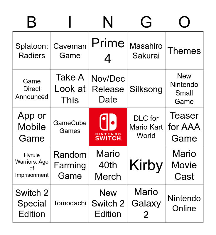 This bingo card has a free space and 24 words: Random Farming Game, Tomodachi, Nov/Dec Release Date, Switch 2 Special Edition, Themes, Splatoon: Radiers, Game Direct Announced, Caveman Game, DLC for Mario Kart World, Mario 40th Merch, Silksong, App or Mobile Game, Kirby, Mario Movie Cast, Take A Look at This, Mario Galaxy 2, Teaser for AAA Game, Prime 4, New Nintendo Small Game, GameCube Games, Nintendo Online, Hyrule Warriors: Age of Imprisonment, Masahiro Sakurai and New Switch 2 Edition.