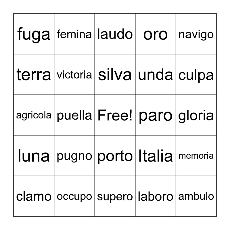 This bingo card has a free space and 45 words: adoro, ambulo, amo, clamo, judico, laboro, laudo, libero, navigo, occupo, oro, paro, porto, pugno, specto, supero, voco, agricola, aqua, culpa, femina, filia, fortuna, fuga, Gallia, gloria, herba, Hispania, Italia, luna, Maria, memoria, mensa, nauta, patria, puella, regina, Roma, sella, silva, terra, unda, via, victoria and vita.