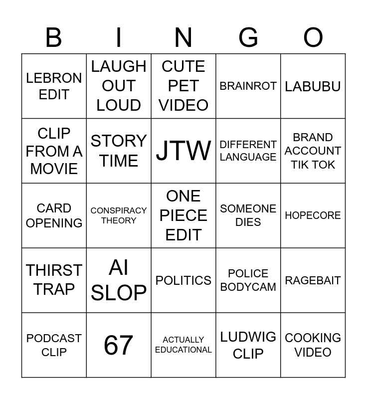 This bingo card has a free space and 24 words: AI SLOP, 67, JTW, PODCAST CLIP, LABUBU, LEBRON EDIT, CLIP FROM A MOVIE, LAUGH OUT LOUD, SOMEONE DIES, POLITICS, DIFFERENT LANGUAGE, CARD OPENING, POLICE BODYCAM, RAGEBAIT, STORY TIME, LUDWIG CLIP, HOPECORE, CUTE PET VIDEO, BRAND ACCOUNT TIK TOK, CONSPIRACY THEORY, COOKING VIDEO, THIRST TRAP, BRAINROT and ACTUALLY EDUCATIONAL.