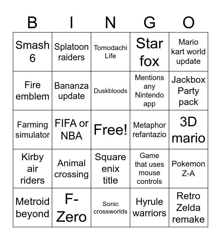 This bingo card has a free space and 24 words: Animal crossing, F-Zero, Duskbloods, Metroid beyond, Mario kart world update, Smash 6, Fire emblem, Splatoon raiders, Metaphor refantazio, Square enix title, Mentions any Nintendo app, Farming simulator, Game that uses mouse controls, Pokemon Z-A, Bananza update, Hyrule warriors, 3D mario, Tomodachi Life, Jackbox Party pack, FIFA or NBA, Retro Zelda remake, Kirby air riders, Star fox and Sonic crossworlds.